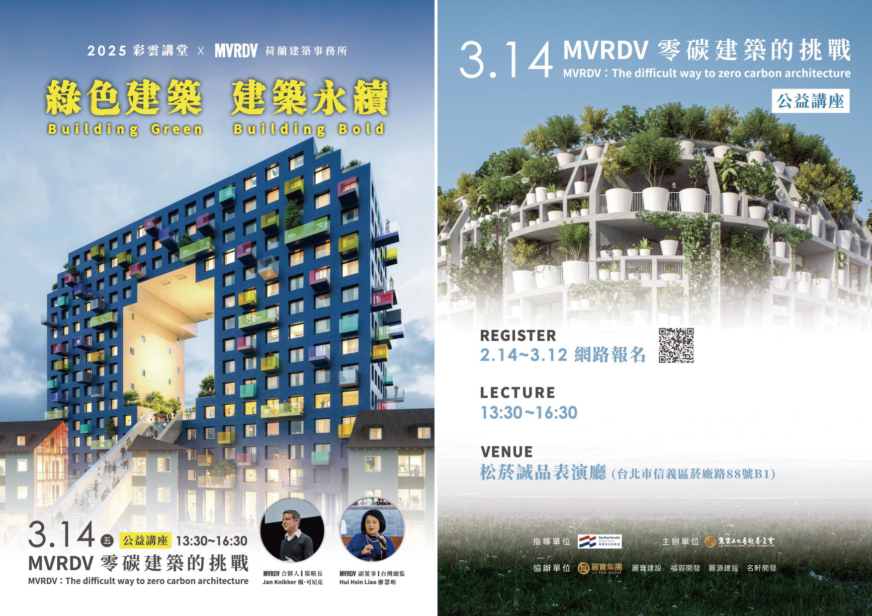 麗寶文化藝術基金會特地邀請來自荷蘭的國際頂尖建築事務所MVRDV的合夥人暨策略長楊‧可尼克(Jan Knikker)建築師,以及建築師事務所副董事暨台灣總監廖慧昕(Hui Hsin Liao)建築師,分享前瞻的建築觀點。該建築事務所有多項作品都得到國際獎項的肯定,並且融合周邊的地景和文化,形成獨特的標示型建築,例如:The “O”。