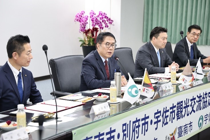 黃偉哲市長表示,臺南是臺灣的歷史古都,也是科技新城,臺南跟別府皆以溫泉著稱,而跟宇佐則同有深厚的宗教文化氣息,三市之間擁有許多相似之處,十分適合推動觀光交流,非常感謝駐福岡辦事處陳銘俊處長的引薦。黃市長進一步指出,12月底臺南即將與熊本直航,跟九州之間的往來將更加便利。他期待透過締結協定,三市的觀光資源可以互通,並促進相互理解,進而將三市的友誼綿延下去。