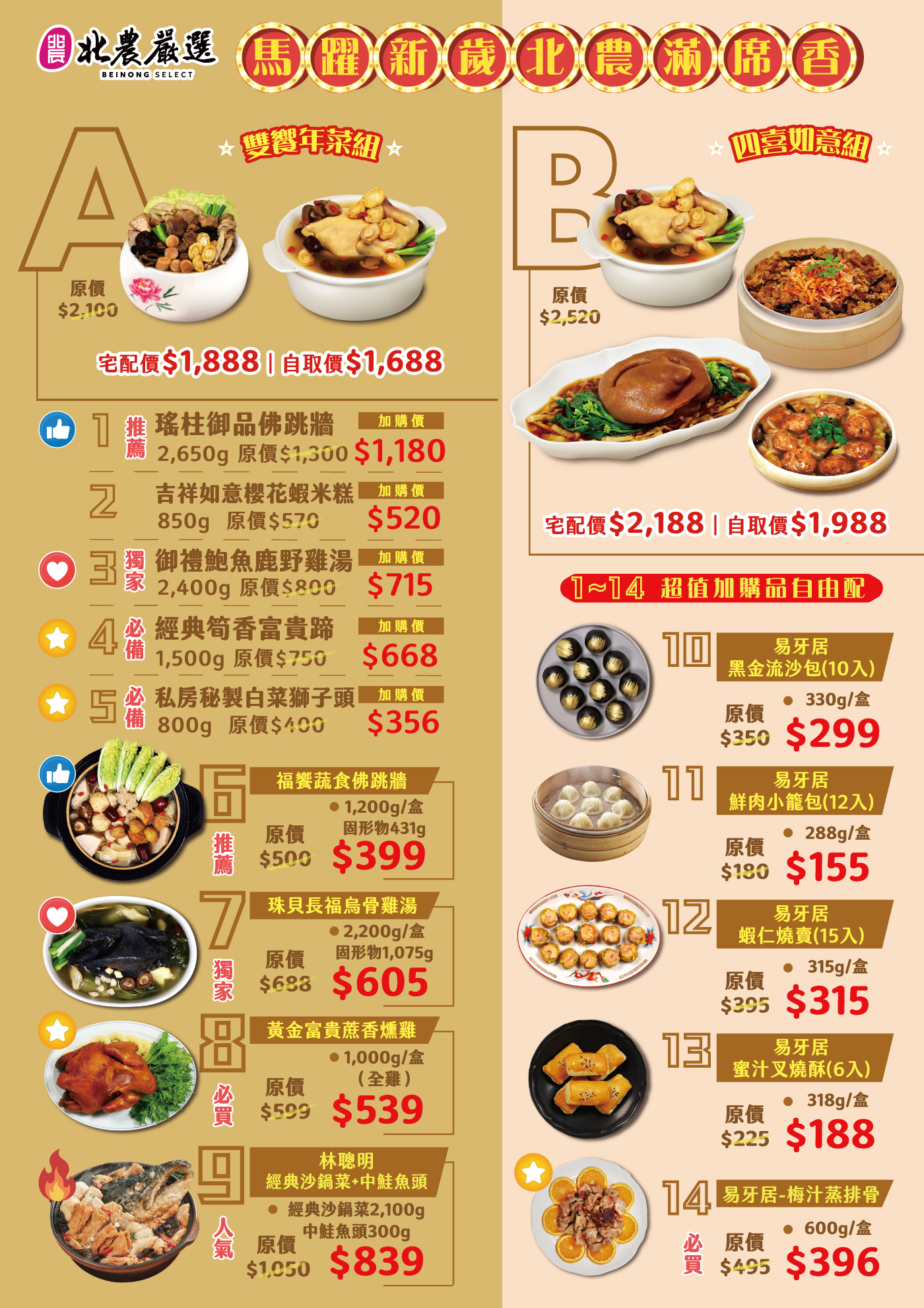「北農嚴選」提醒消費者,為配合物流繁盛期,年菜宅配訂單將於115年2月4日截止(1月6日後之訂單恕不指定到貨日期),若選擇自取則可至2月15日止。面對首月至今即破千套的熱銷態勢,熱門品項庫存快速減少中,呼籲還未準備年菜的民眾盡早至「北農嚴選」官網下訂,讓金馬年圍爐滿席飄香,輕鬆過好年。