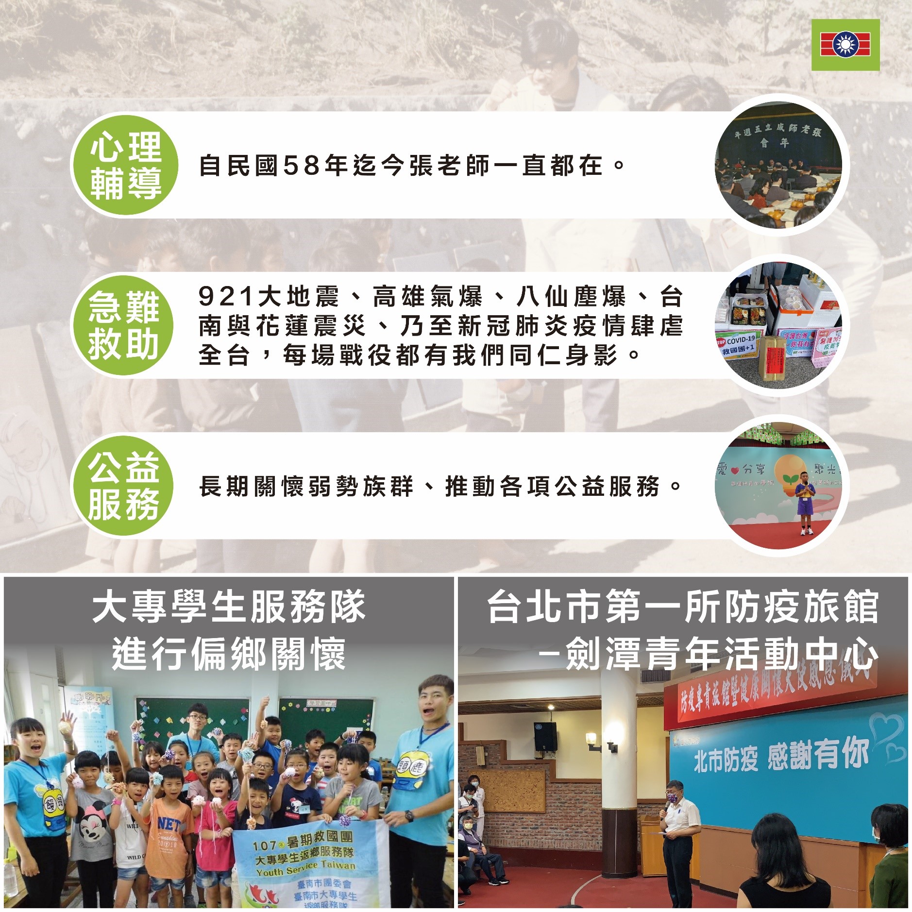 從一般人所熟知的張老師1980專線、線上心理講座外,在疫情期間,救國團更是持續發動各縣市的義工捐血,解決台灣的血荒問題,更發動募捐防疫物資贈送給辛苦的醫護與警消人員,救國團主任葛永光表示,「救國團代表的就是真正的台灣價值,包括國家至上主義、利他主義、人本主義等,希望大家一起弘揚這些台灣價值,讓社會更和諧」。