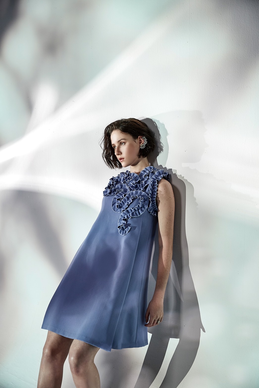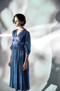 「HUANG SHU CHI 黃淑琦」流行事業今年春夏以大西洋藍、橄欖油綠、奶油色及蜜桃粉橘為主打色。並以花瓣的堆疊和綻放、葉脈的交錯和疏離、蕈類的褶皺和層次為設計理念。花卉葉脈擁有優美形體與線條,能給予人視覺及心靈美的感受,這個單元融合品牌擅長的晚禮服,如花朵綻放,讓生命力絲絲蔓延。