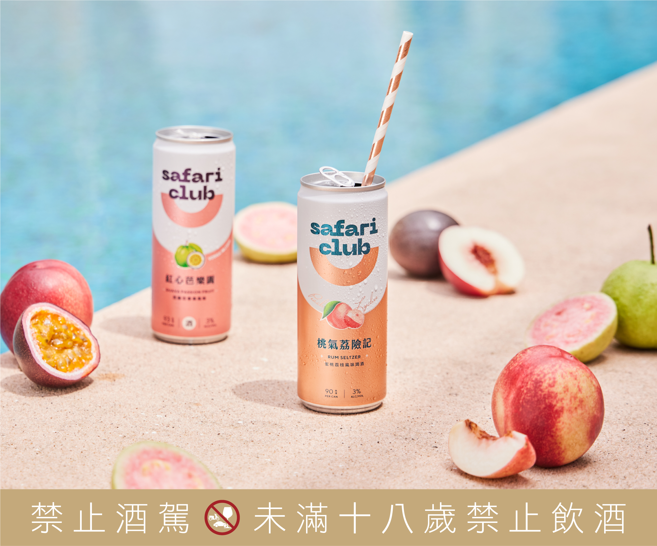 金車Safari Club「桃氣荔險記」,以蘭姆酒為基底,融合香甜蜜桃與水潤荔枝的雙重水果滋味,搭上清爽氣泡及3%低酒精濃度,提供生活中剛剛好的微醺作用力。包裝設計上,維持金車Safari Club品牌精神「Live a little」,半圓標識是微笑,也是你我的生活圈,刻意預留半邊的半滿狀態,強調適當的空白喘息,能讓自己用更正向的態度面對生活,並以質感香檳粉作為這款風味的視覺主色,呼應蜜桃和荔枝的粉嫩色系。